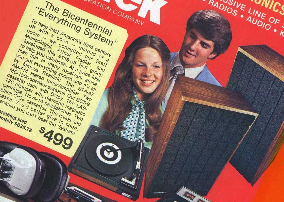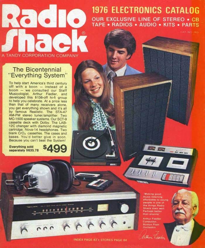 Radio Shack, on the cover of their 1976 catalog, offered something called The Bicentennial “Everything System”. Which they claim is the best way to kick off America’s 3rd century (with a boon, not a boom).