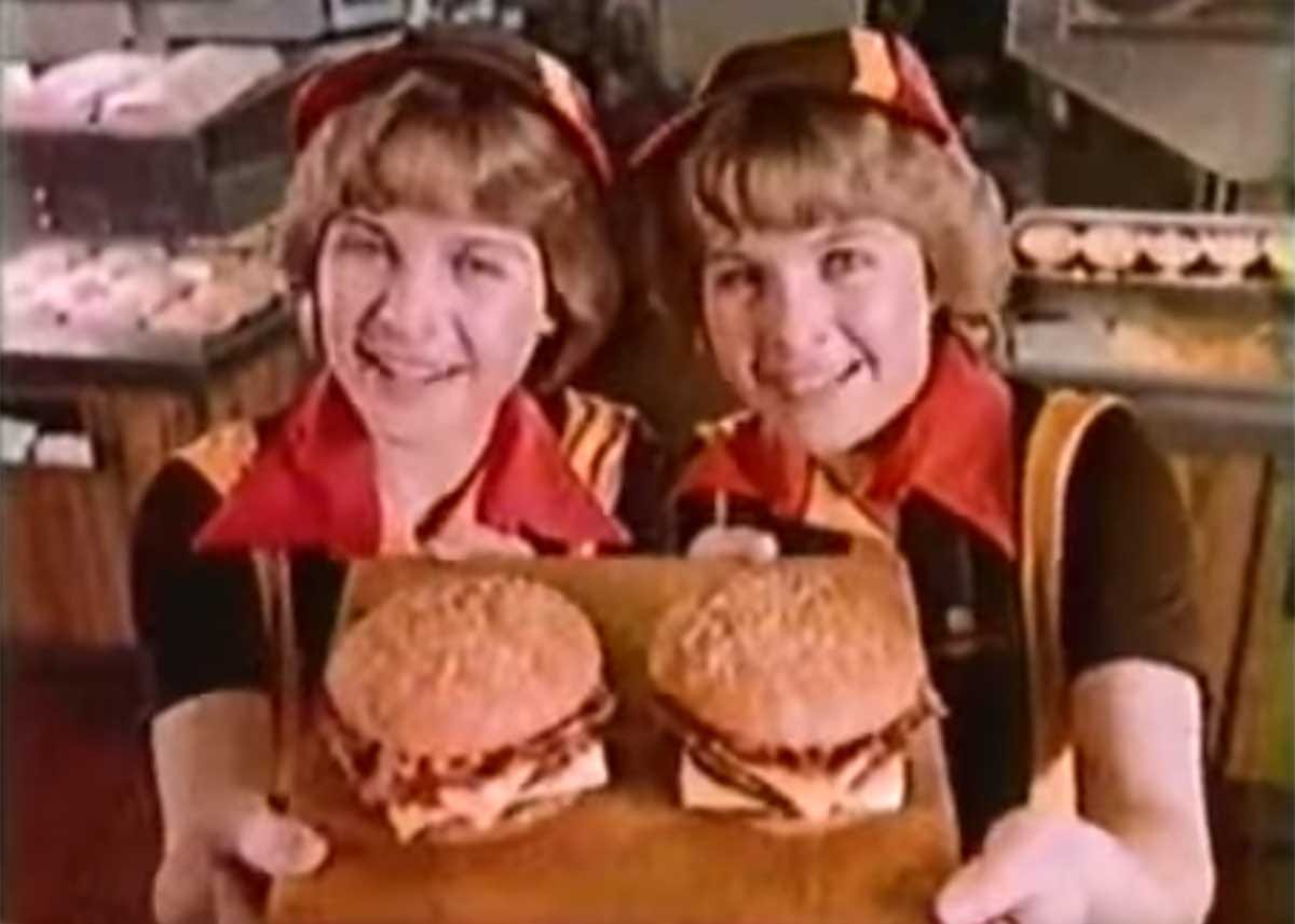 This first one takes a page from Doublemint Gum and decides to riff on the whole double aspect of this tasty burger while featuring various sets of twins. The slogan, “better get it on the double” was clever, but it never caught on. Also the bun in this glamour shot of the burger looks really dry, although pleasantly awash in sesame seeds.
