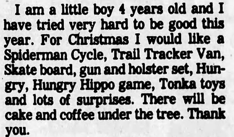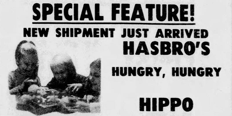 It’s hard to find sales figures for the game, but you can find evidence for its popularity when browsing old newspapers. If you turn to the 'Letters to Santa' sections, that used to be very popular, you will find thousands of kids of all ages, asking for Hungry Hungry Hippos. And it doesn’t end in 1978. Demand for the game seemed to always climb around the holidays, and I found frequent mention of it well into the 1980s.