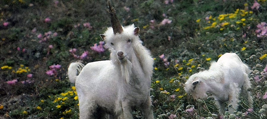 In the 1970s, the two of them were researching a book on legendary animals when they came across Dove’s old paper. The idea lit something up in Zell. He studied the technique and using angora goats for their luxurious coats and cross-breeding them with Saanen goats to get slightly higher legs, he was able to successfully get his bleating patients to grow a single horn without complication. The procedure, just like with Dove’s bull, was done within the first week of a kid’s life while the horn buds were still loose under the skin. This left the animal with a single fused horn growing from the center of its forehead (again, just like with the bull). Lancelot was born in the spring of 1980. He was the first to get the procedure.