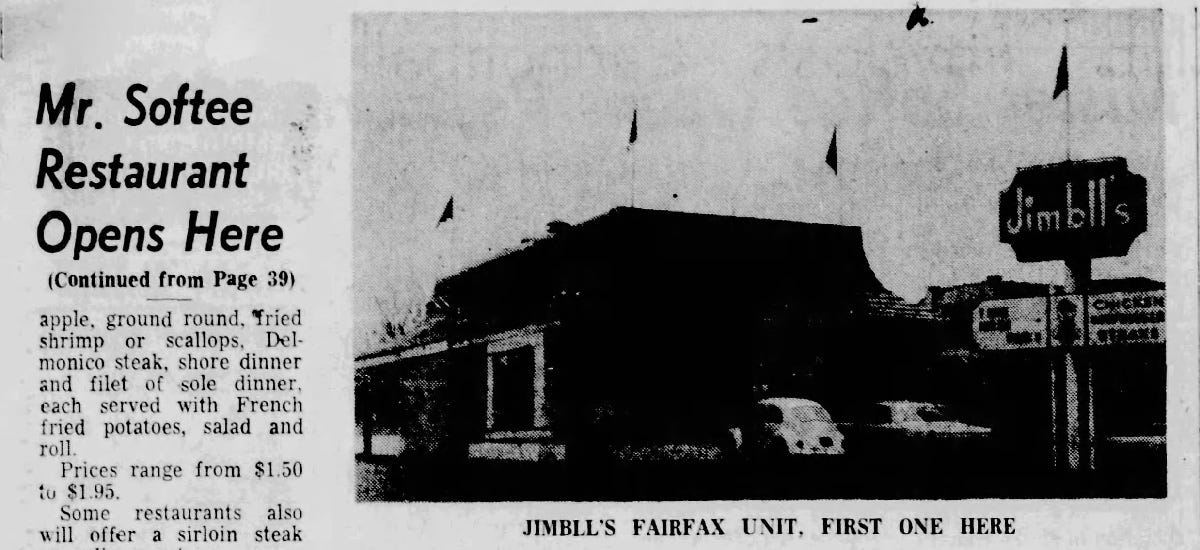 The menu had grown more ambitious. Jimbll’s featured “charcoal sirloin steaks,” “Big Jim Beef” sandwiches (described as “sliced roast beef piled high on a toasted bun”), fried chicken, seafood platters, and shore dinners. The Cincinnati location’s steak platters ranged from $1.50 to $2.19, while dinners from appetizer to dessert cost between $1.85 and $2.35. And yes, dessert was still Mister Softee ice cream. Multiple flavors and “a couple of dozen styles from plain dishes to the $2.25 Tummy Buster that consists of everything in the shop piled on half a gallon of ice cream.”