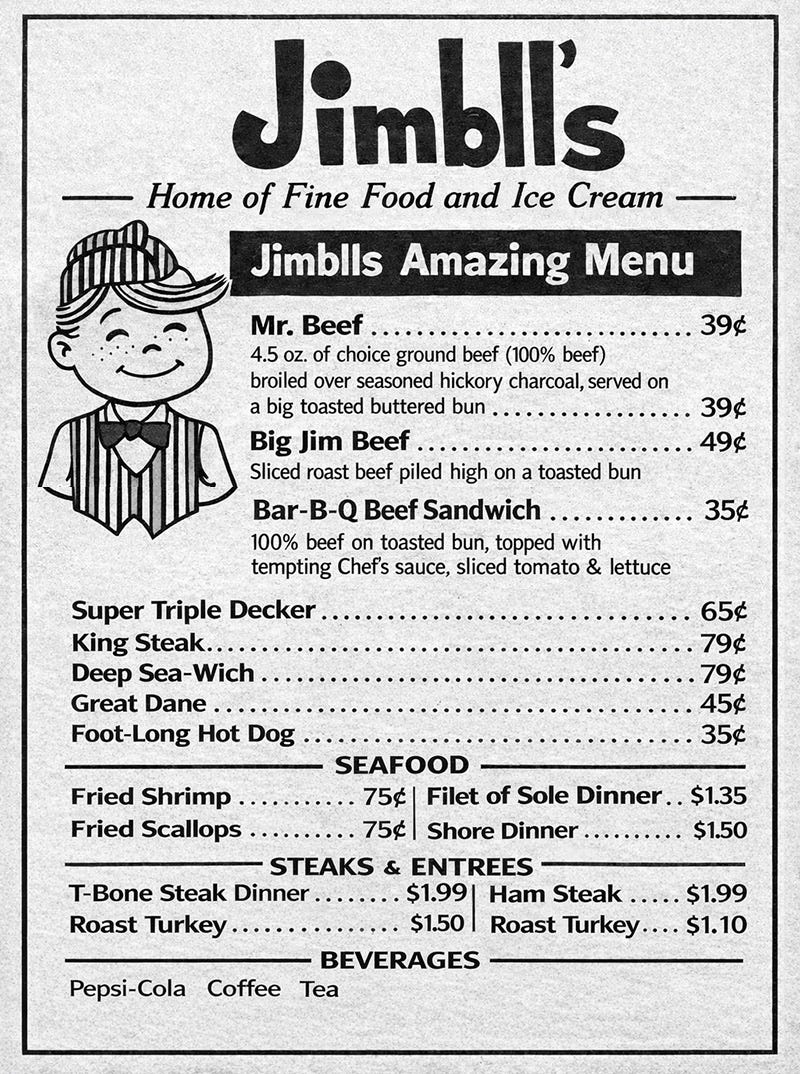 Still, for a brief period in the late 1960s, you could walk into a Jimbll’s on a Friday night, order a shore dinner or a sirloin steak, and finish with a Tummy Buster sundae. And my mother, wherever she was, remembers it happened. That’s good enough for me.