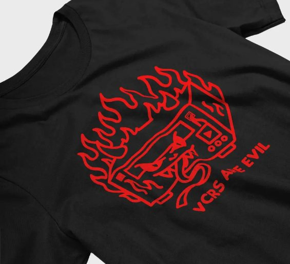 While reading about this chapter in VCR history I thought it would be fun to come up with a design that would embody the fears and potential panic around the technology. My initial thought was to use it as the featured image at the top of the article, but I decided it might be more fun to put on a t-shirt. So I give you my “VCRS ARE EVIL” t-shirt. Wear it with pride and confuse everyone who sees it.