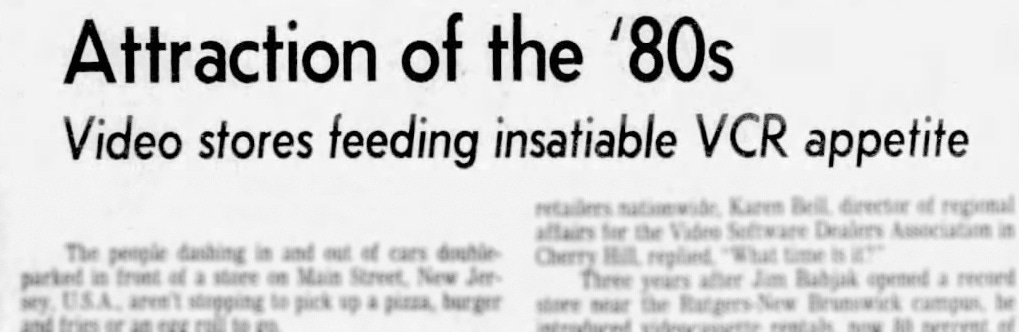 "Attraction of the ’80s: Video Stores Feeding Insatiable VCR Appetite" appeared first. It focused mainly on video stores, the very places I would find myself working for many years. The article highlighted massive growth, estimating 14,000 video rental stores spread across the United States serving the 17% of the population that owned a VCR. One person they interviewed mentioned that five video stores had opened near his home. This aligned with my experience at the time. My town wasn’t big, and we had that many if you included the supermarket, which was also renting videos.
