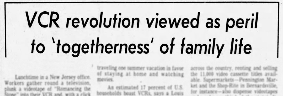 This first article gave you a sense of where we were. The second article, published the next day, was titled "VCR Revolution Viewed as a Peril to Togetherness of Family Life." This one just screen “VCR Panic” as it tried to spotlight the unforeseen consequences of this rapidly adopted technology. Estimating that by 1990, more than half of American households would own a VCR, it asked: What impact will this have on the American lifestyle?