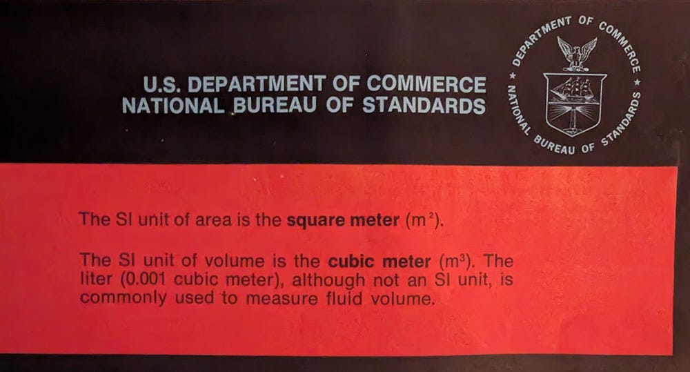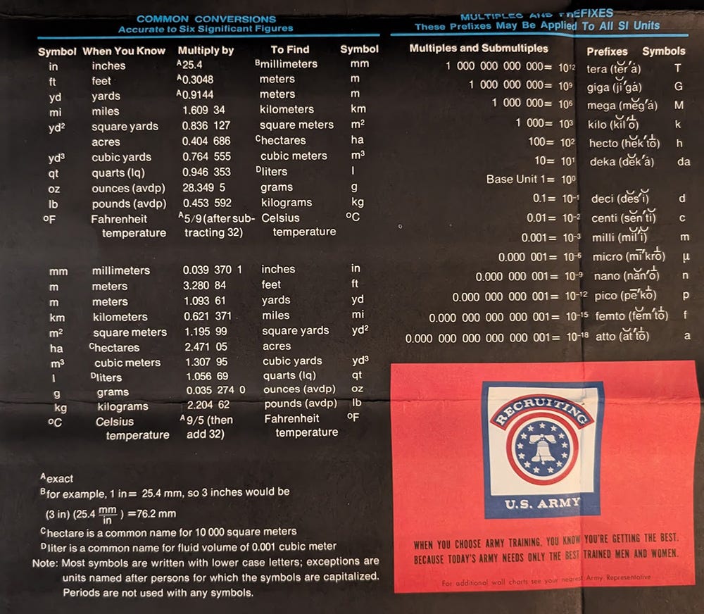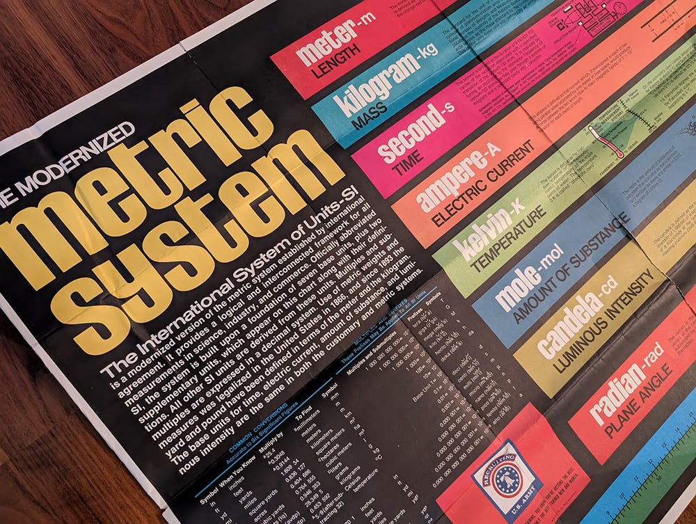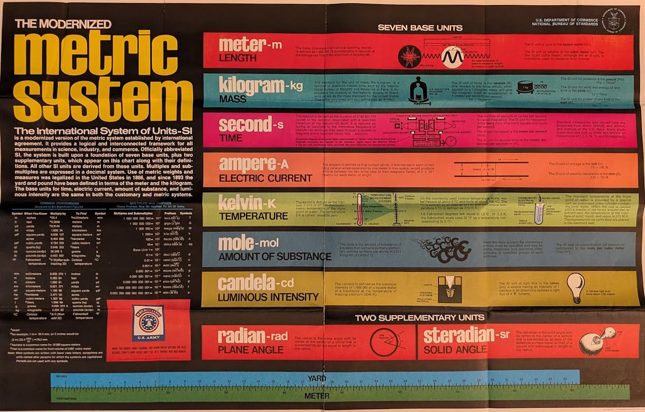 Being able to see it up close, I discovered that it was distributed by the U.S. Department of Commerce National Bureau of Standards in 1972. So this poster predates the Metric Conversion Act. They offered a few metric publications that you could send away for, ranging in price from 30 cents to $3. This poster might be titled National Bureau of Standards Special Publication 304 and would have run you about 55 cents—which is significantly less than people charge today for a copy.