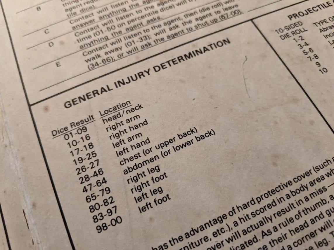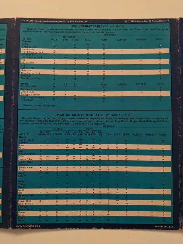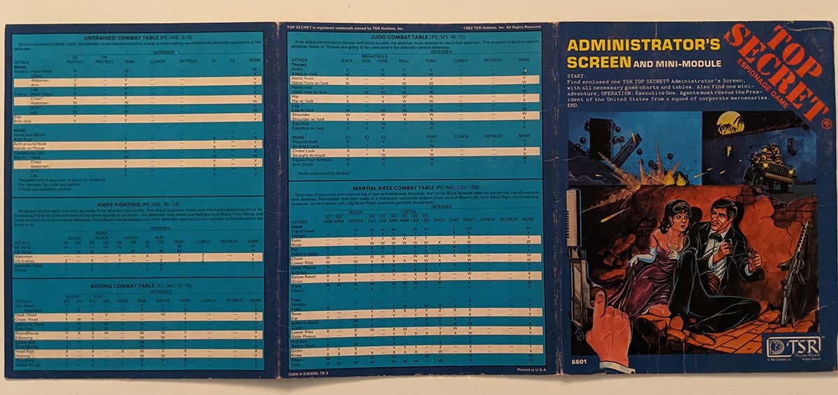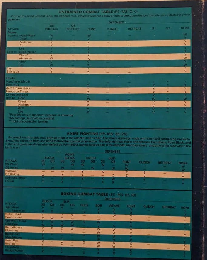So what could you find on the outside of the screens? Well besides the cool art you see above, they included several combat tables all laid out in colorful blue and white. They included tables for: Untrained Combat, Knife Fighting, Boxing, Judo, and Martial Arts.