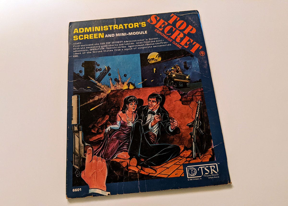 Top Secret, with its emphasis on SECRETS, seems to be a perfect match for a set of screens. My only complaint about this set is that it is a single screen. The area one screen can cover was never suitable for my needs, and I would have to use a folder or a Dungeons & Dragons Screen to increase my table real estate.
