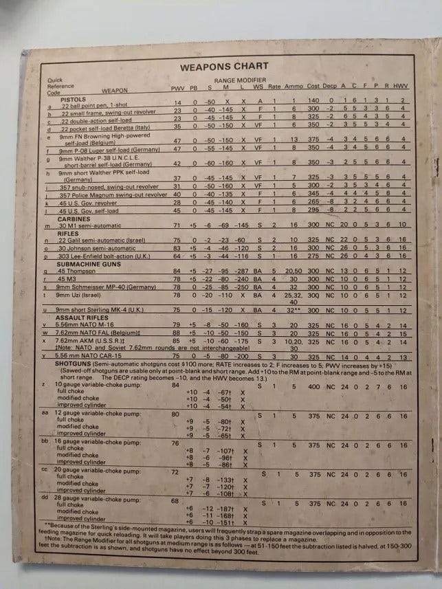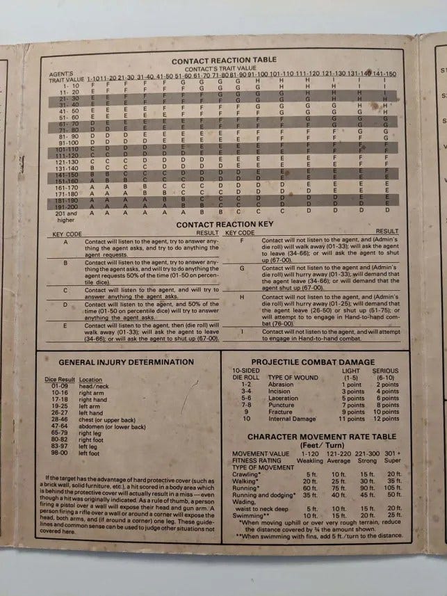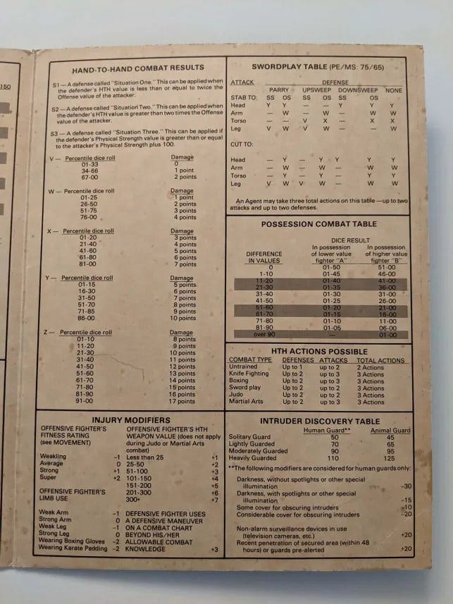 Included are charts for Weapons, Contact Reaction, Genera; Injury, Projectile Combat Damage, Character Movement Rate, Hand to Hand Combat, Swordplay, Possessions Combat, HTH Actions, Injury Modifiers, and Intruder Discovery.