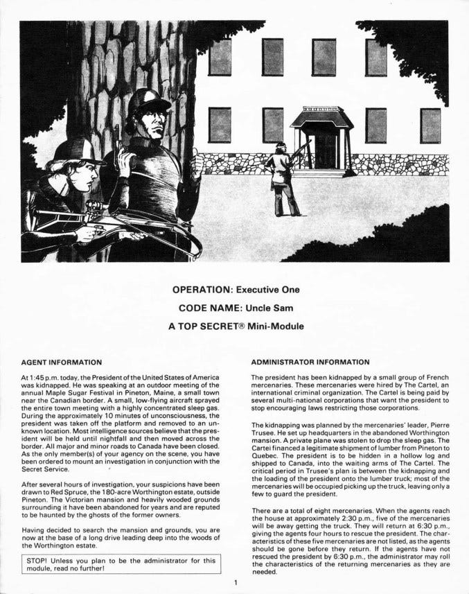 Find Enclosed one TSR TOP SECRET Administrator’s Screen, with all the necessary charts and tables. Also find one mini-adventure, OPERATION: Executive One. Agents must rescue the Presidents from a Squad of Corporate Merceneries.