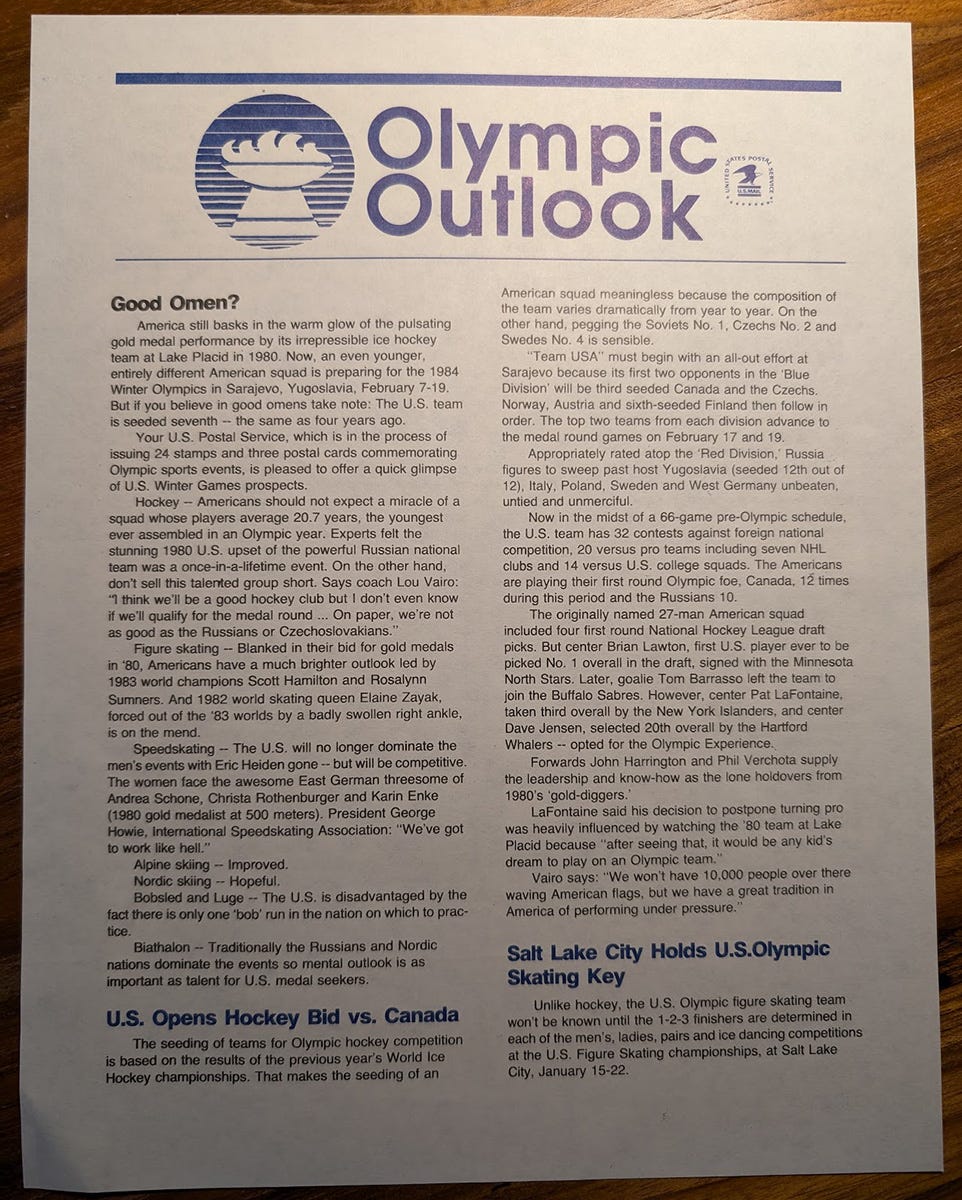 An unusual bit of ephemera was a printed newsletter called the “Olympic Outlook.” Each one was printed on one sheet of paper, both sides, and featured news about the Olympics. The folder came with one, but it looks like you could read and pick up new ones at your local post office. I find it charming that the post offices were attempting to be a hub for Olympic activity in communities across the country. And, in a pre-internet world, this would have been a solid source of Olympic information for many communities. We might not need things like this anymore, but I wouldn’t mind if we did.