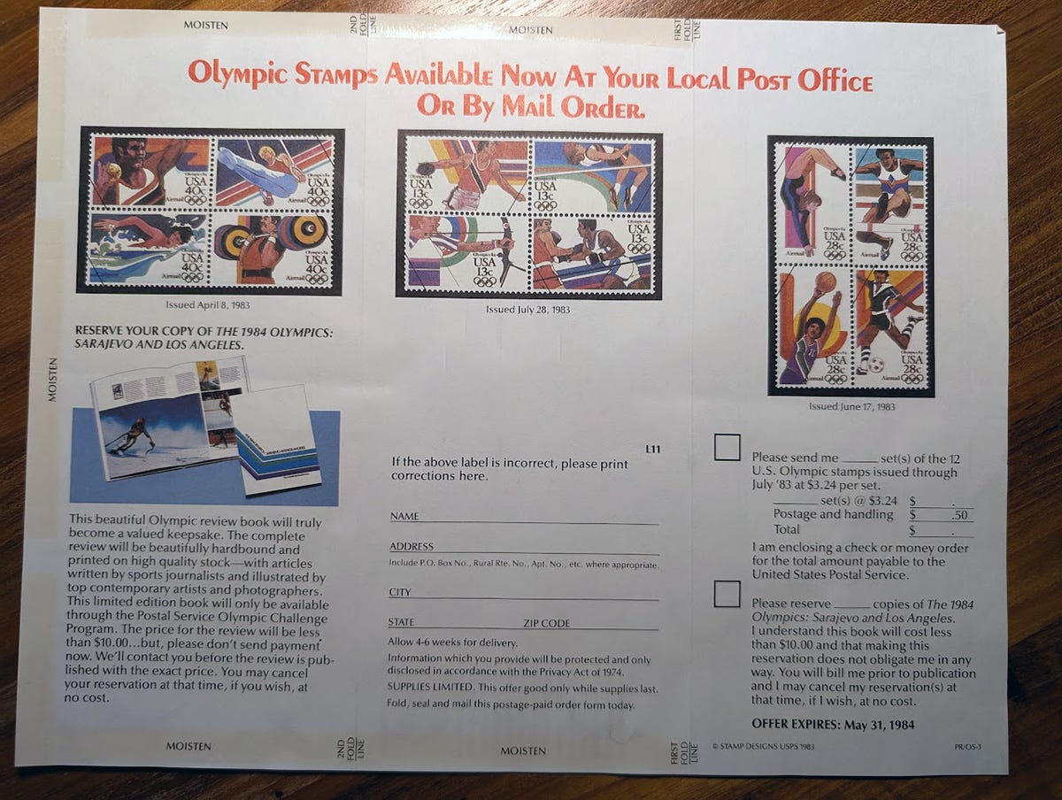 They also had a book that they claimed would “become a valuable keepsake,” The 1984 Olympics: Sarajevo and Los Angeles. They estimated the cost of the book at about $10, which is about the same as what you will pay for a copy today. Stamps could be purchased at your post office, or you could order them through the mail.