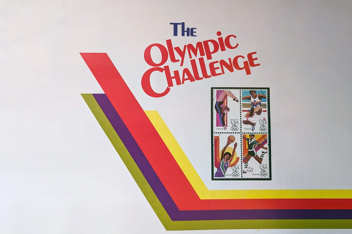 For many young people, this would be a colorful and exciting introduction to the world of stamp collecting. The surrounding hype started at least the year before the games, when there was an unveiling of the plans in print media and on television. The optimism around the release is demonstrated well in this commercial they ran in 1983 featuring Hardy Rawls. In it, you get to see what you would have spotted going to a post office that year: a giant display about the stamps, but also a premium offering you could get from the post office as part of the Olympic Challenge, a full-color poster and collector folder.