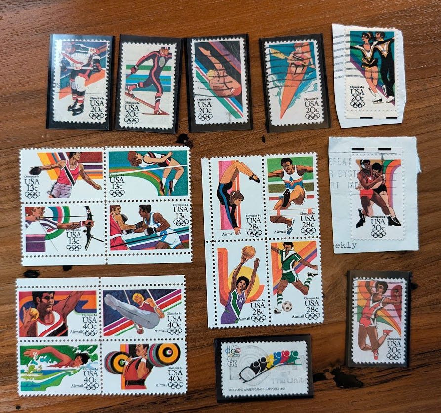 Finally, there were the stamps. They would start being issued on July 28, 1983, and according to what I read online, they made so many that they lingered for a while afterward. Each set of stamps consisted of 12 stamps that colorfully captured an Olympic sport, all of them with an athlete in motion. The denomination of these stamps varied, starting at 13 cents, which was a denomination that met the mailing rate for postcards at the time, and moving into airmail denominations of 28 and 40 cents.