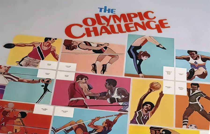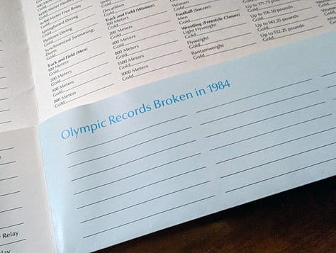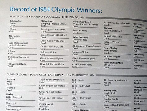 While the poster was cool and eye-catching, and on the surface might be the more compelling of the two offerings, the folder had a feature that was hard to beat. It had a listing of every event in the Games that year and a place for you to record who won the gold medal in that event and a place for records broken. Not only did it have all the Summer Olympics, but it also had a smaller section for the Winter Olympics in Sarajevo.