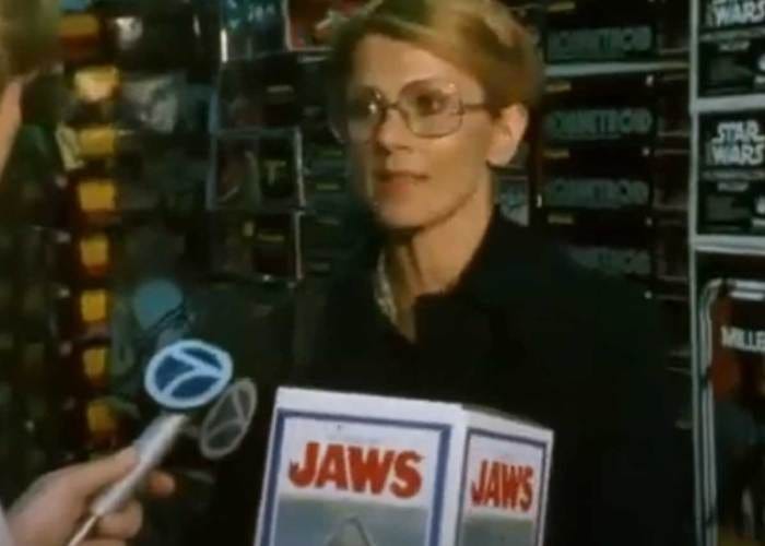 The next interview is with another parent. She also mentions how durable the figures are and then gets a little confused about all the names, throwing 2XL in the mix. You know this footage is good when someone is standing in front of a giant display of Star Wars figures and is holding a Jaws Game.