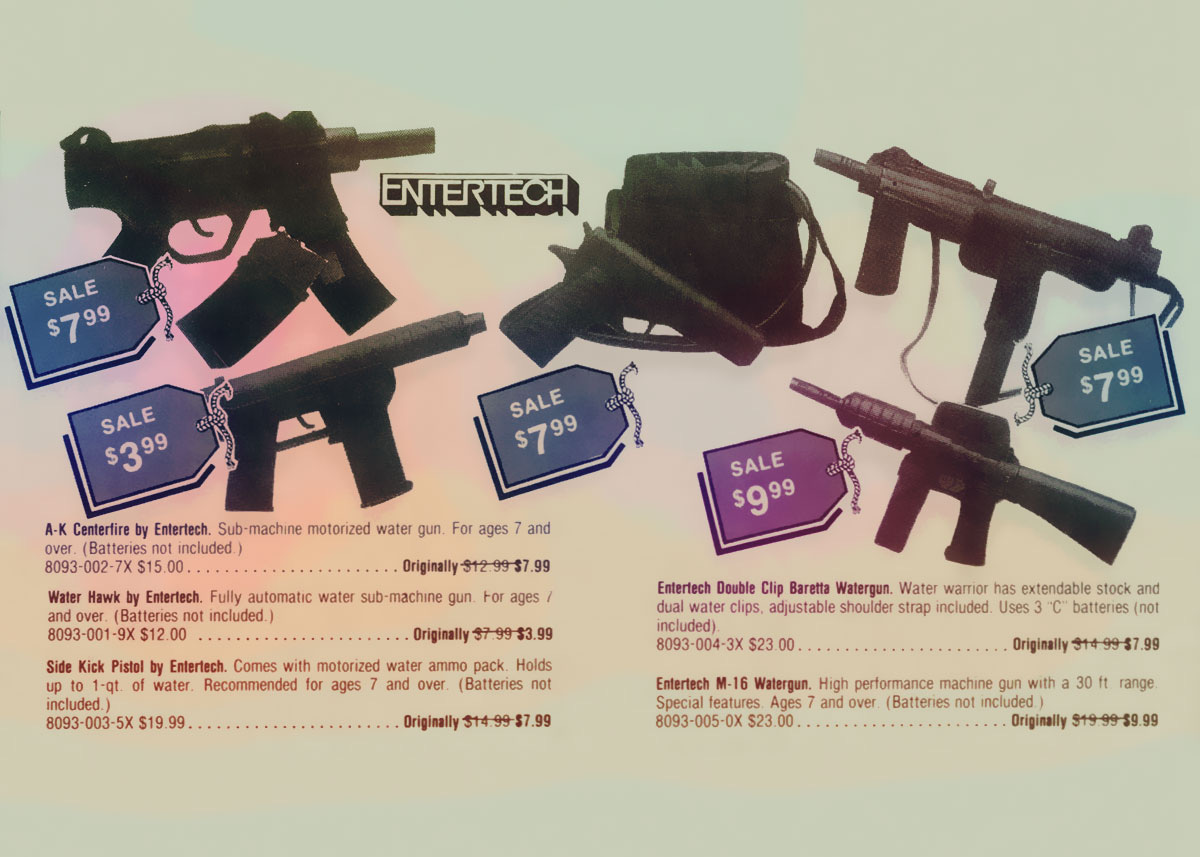 The Entertech line was terminated in 1990, right around the time of the Super Soaker phenomenon taking hold in the U.S. It’s a shame they didn’t survive, this was the last big water gun buying hurrah for my group of friends, and I am sure they could have come up with some great battery-powered alternatives to the Super Soaker.