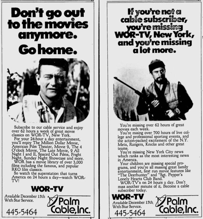 WOR-TV, as a local station had a solid reputation for showing movies. In fact, the channels were broadcast by cable TV service outside of the NJ/NY area to appeal to people who had gotten accustomed to its quality offering but had moved away. Here you see a cable company pushing WOR-TV in Florida. Notice the mention of Fright Night.